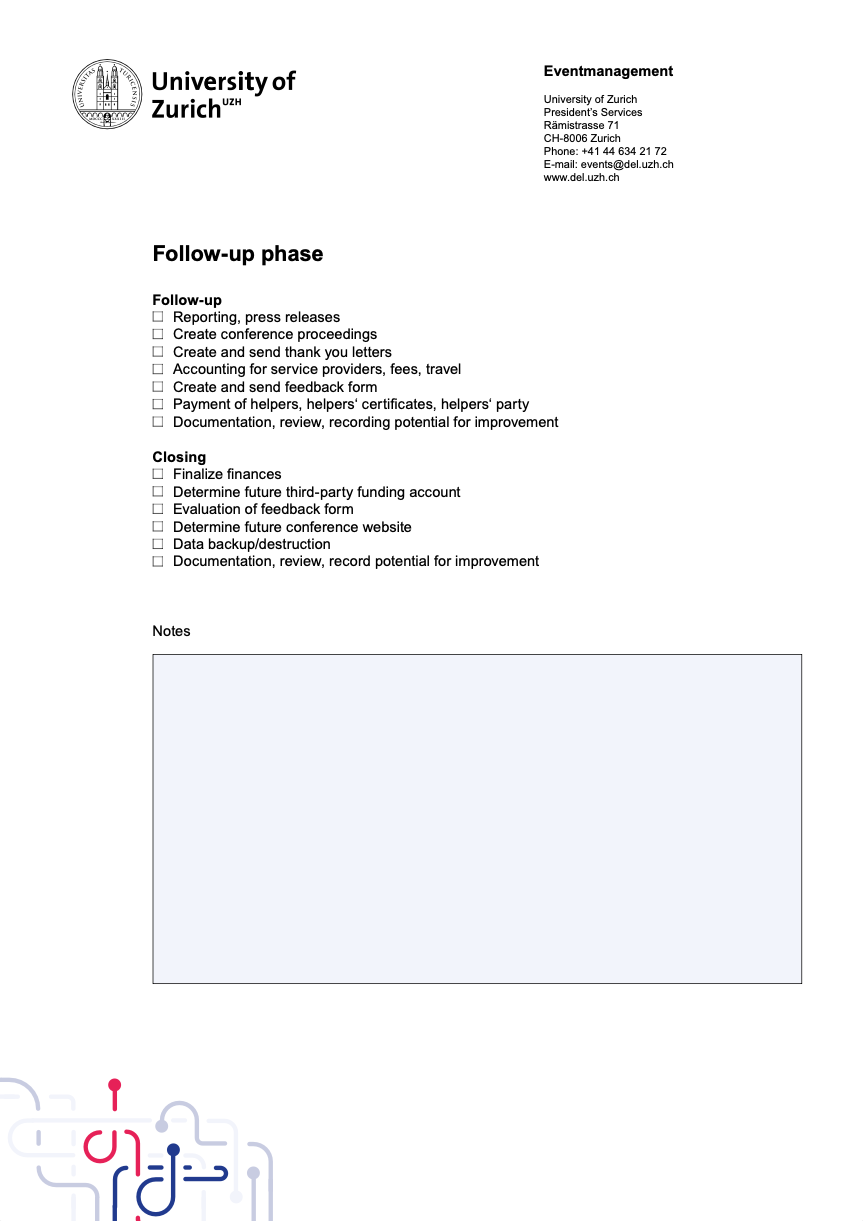 The Follow-up Phase Checklist (PDF, 120 KB) provides information on how to conclude an event in an orderly manner. At the end, the event’s finances need to be closed and any suggestions for improvements recorded.